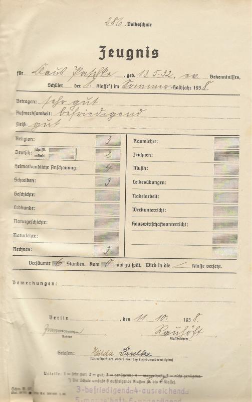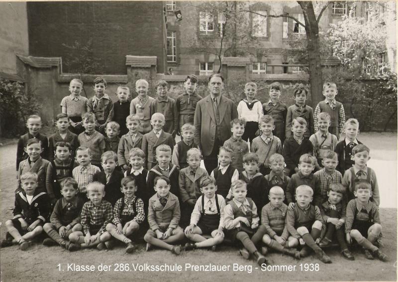 Klassenfoto und Zeugnis der 1. Klasse der 286. Volksschule im Sommer 1938