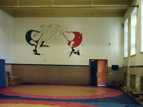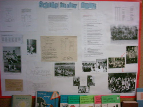 Es existiert noch die kleine Turnhalle sowie die Umkleideräume in der unteren Etage. Ich musste sofort an Frau Huht denken. Leider war alles verschlossen, aber durch das Schlüsselloch konnte man noch alles erkennen. Auch der Schulhof, wo früher Sport betrieben wurde, ob es Weitsprung oder 100-Meter-Lauf war, wird gerade umgestaltet.